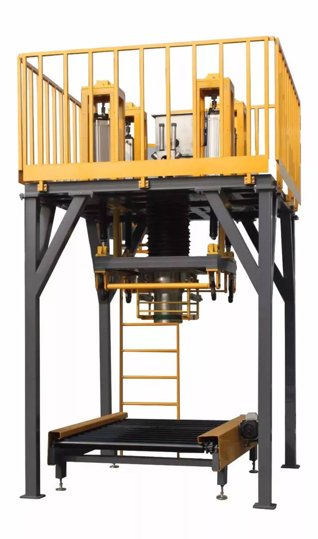 固定在稱重平臺(tái)上。具體包括二只氣動(dòng)升/降機(jī)構(gòu)、四只導(dǎo)向機(jī)構(gòu)等。根據(jù)實(shí)際充填狀況,可將稱量中的料袋在某個(gè)時(shí)點(diǎn)上下升降數(shù)次,以保證的填充效果。另一方面,當(dāng)稱重完畢時(shí),將重袋下降至地面或地面的托盤上,亦即將料袋的上部懸掛狀態(tài)轉(zhuǎn)變?yōu)榇椎耐衅馉顟B(tài),從而便于自動(dòng)松開袋口、吊帶自動(dòng)脫鉤等工序的執(zhí)行。